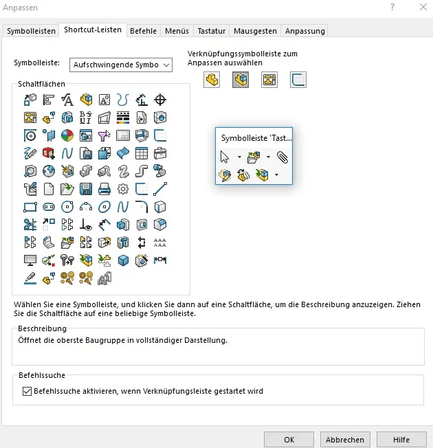 Wählen Sie im Dialogfeld „Anpassen“ unter Symbolleiste einen Befehl oder eine Befehlsgruppe aus, und ziehen Sie die gewünschten Schaltflächen per Drag & Drop auf die Shortcut-Leiste. Im Dialogfeld Anpassen haben Sie ausserdem folgende Möglichkeiten: