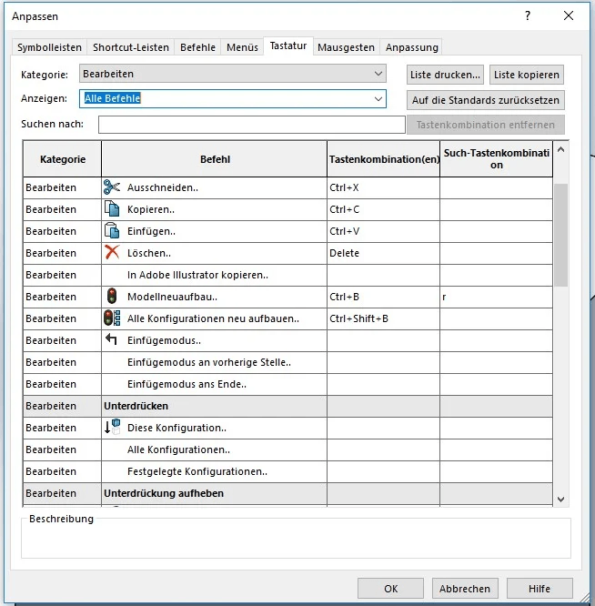Sie können die Shortcut-Leisten für Teile, Baugruppen, Zeichnungen und Skizzen anpassen.