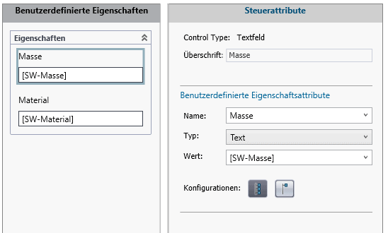 - Wert: In diesem Attribut können wir verschiedene vordefinierte Werte mit dem Textfeld verknüpfen (wie z.B. den Wert SW-Masse oder SW-Material).