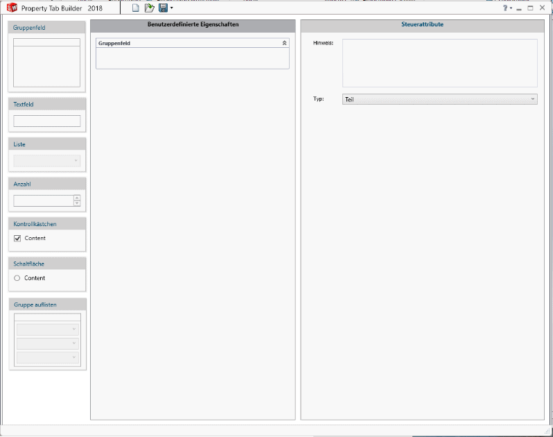 Das jetzt geöffnete Programm Eigenschaften-Registerkarten (oder auch Property Tab Builder genannt) ist eine Benutzeroberfläche zur Definition der grafischen Oberfläche im Task-Fensterbereich.