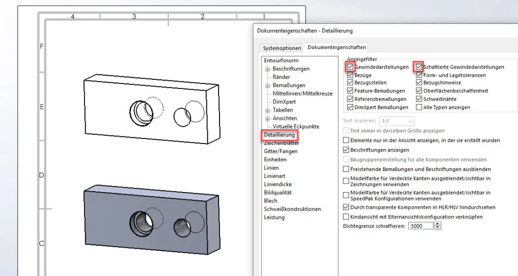 Gewindedarstellungen in Teildokumenten werden in Zeichenansichten automatisch eingefügt. Je nach Anzeigeart wird entweder nur die Gewindedarstellung in Form des Kreises oder aber auch noch die schattierte Gewindedarstellung angezeigt. Über die Dokumenteigenschaften -> Detaillierung haben Sie die Wahl, was Sie angezeigt haben möchten.