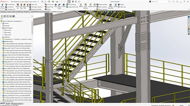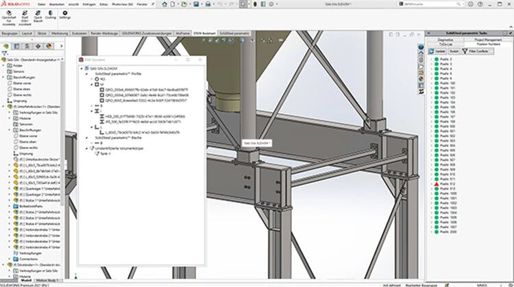 SolidSteel parametric ist ein SOLIDWORKS Add-in für den Stahlbau. Die Software unterstützt Sie von der ersten Skizzenlinie bis zu automatisierten Fertigungsdaten.